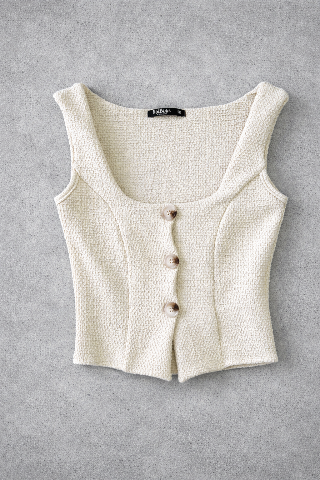 Chaleco de tres botones tipo crop, con textil texturizado ideal para este verano.