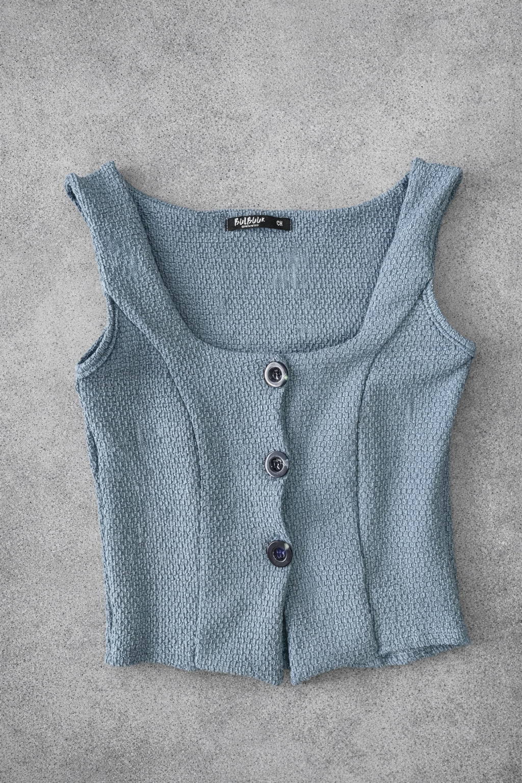 Chaleco de tres botones tipo crop, con textil texturizado ideal para este verano.