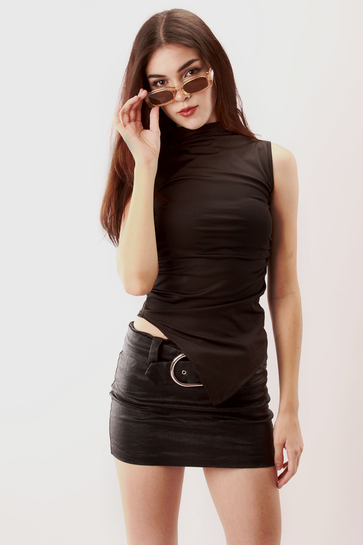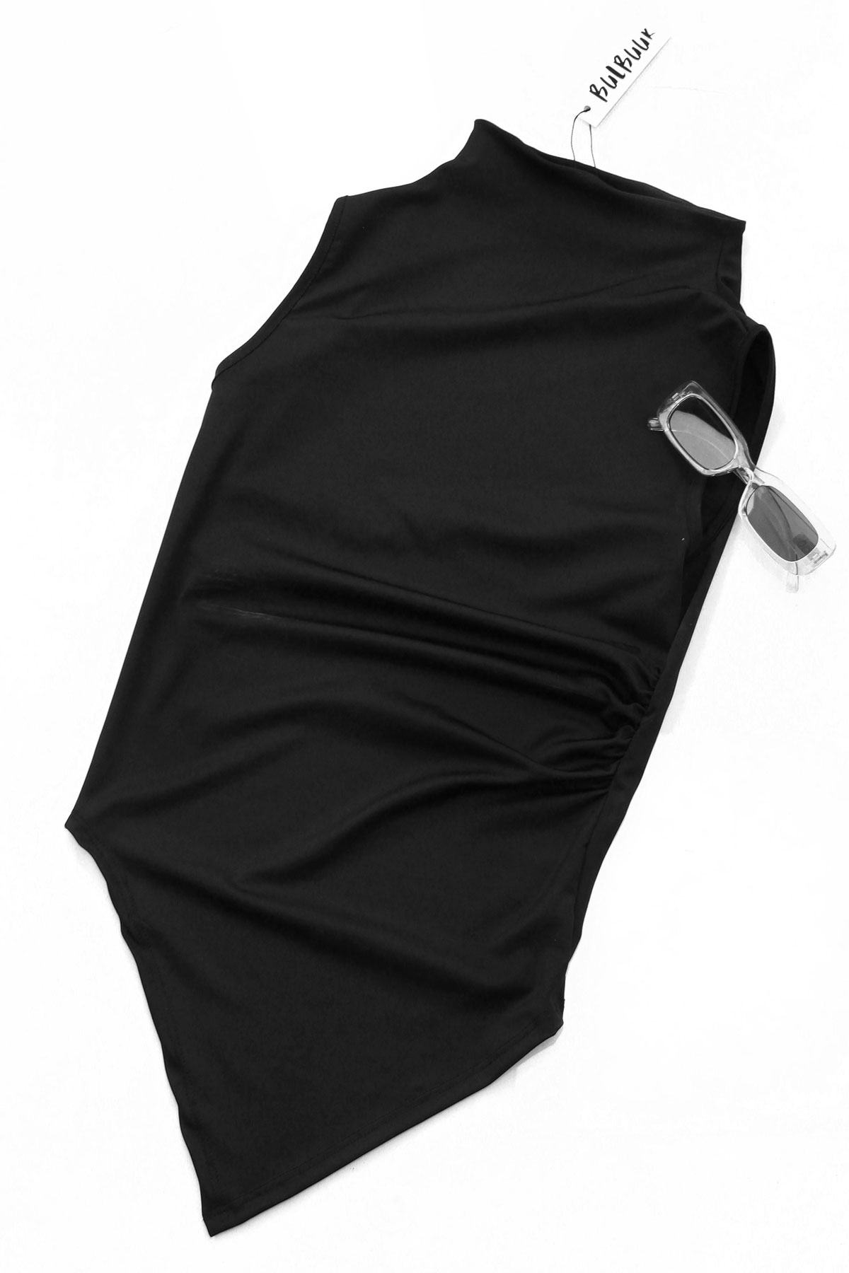 Top Lycra sin mangas cuello alto y detalle de pliegues en costado, además de acentuar su único diseño con corte asimétrico al frente.