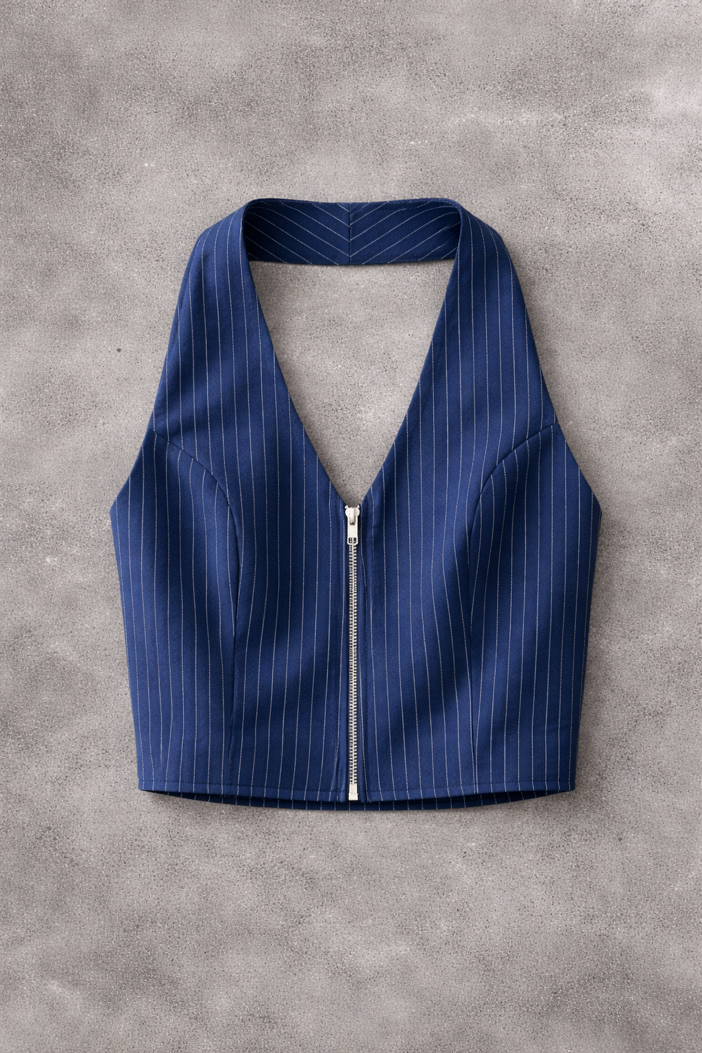 Chaleco tipo halter con cierre metálico al frente.