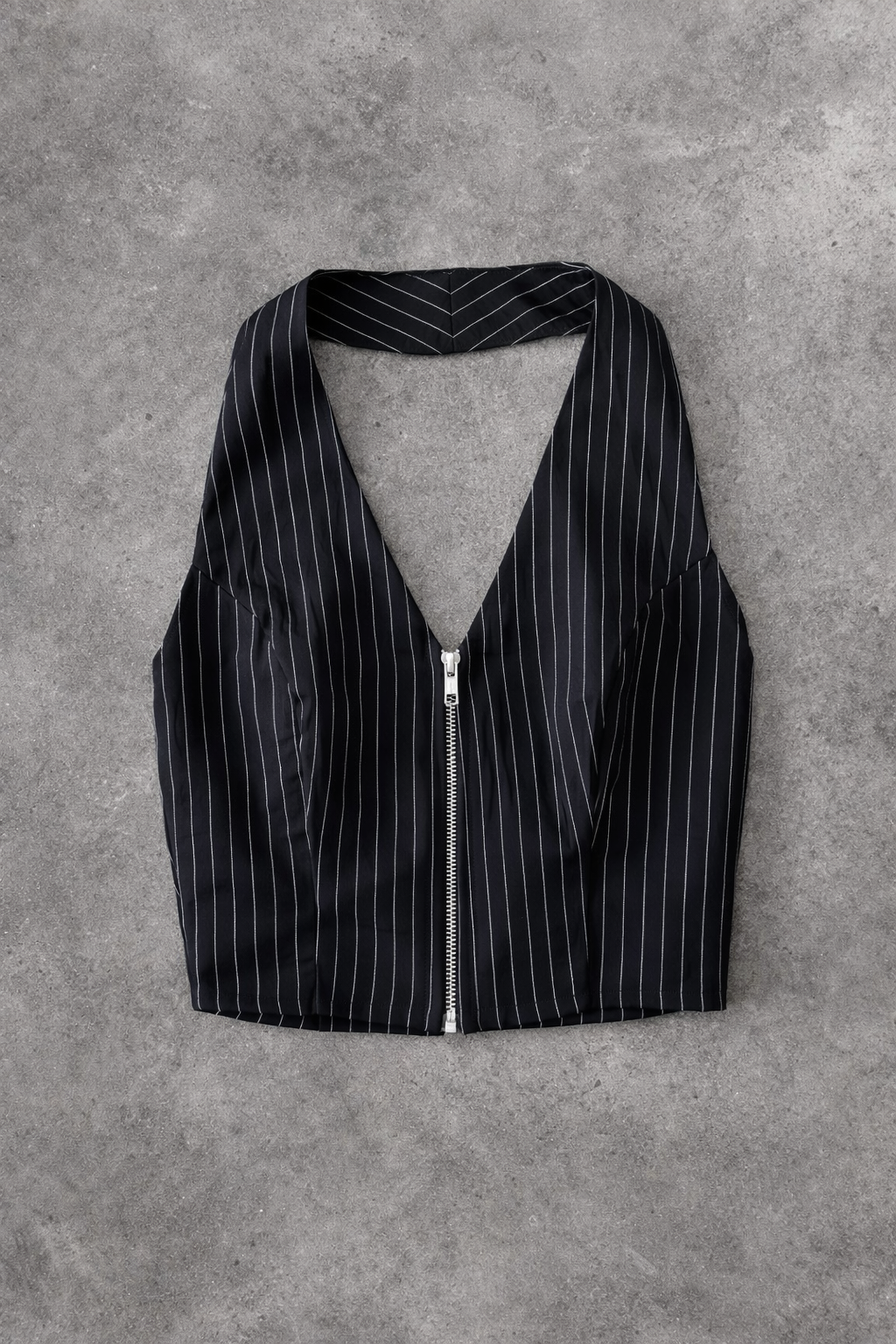 Chaleco tipo halter con cierre metálico al frente.